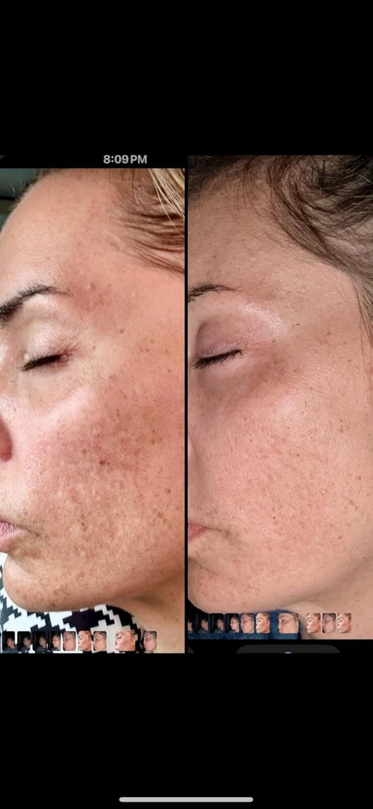 This picture is after a month of use. I've had hyperpigmentation for 10 years from laying on the sun while on antibiotics when I was in my 20s - not smart. The dark spots are fading and significant lighter. Several of the spots and freckles have completely vanished. Now, for the large hyperpigmentation areas on both cheeks, I hope it continues to fade. Again, this pic is only after a month. Visible results in 1 month is amazing for under $30.00. Not sticky as long as you let it dry. Includes retinol which dries skin. I use serum and moisturizer after to avoid drying out and flaking. My skin is not dry or flaking and has a glow. Super silky product and feels smooth on skin, it's refreshing. No smell, and didn't make my face red. It seems to absorb well, but I use a hairdryer in between each product u use to open my pores with the warm air and dries the product faster and absorbs quicker. It application, just like all serums. Very pleased and I am excited to see more results in a month from now.