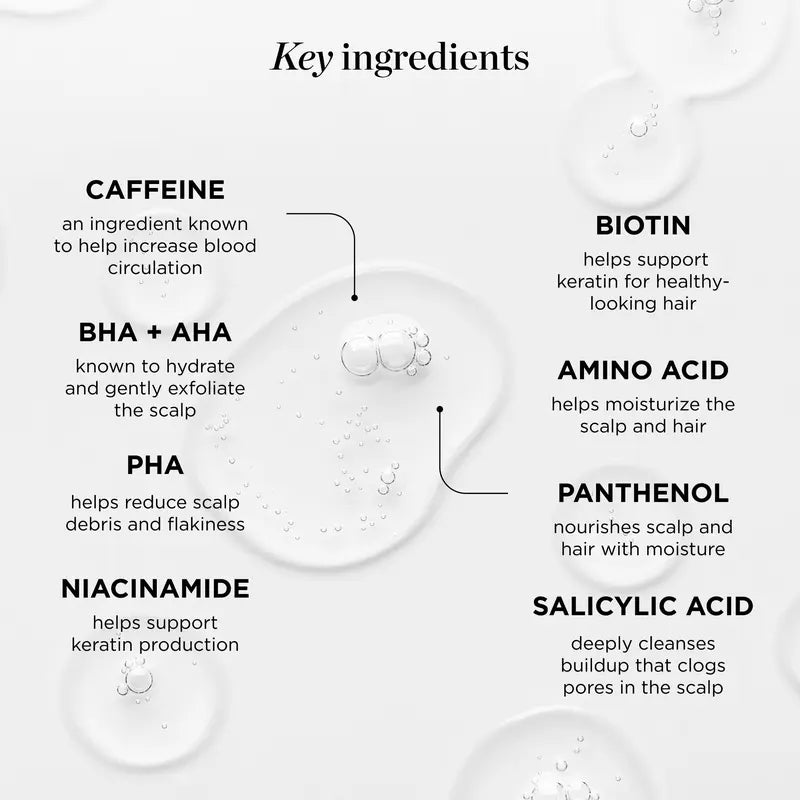 The lightweight, menthol-infused watery gel absorbs quickly, leaving a refreshing, non-sticky finish. Enriched with Biotin, Rosemary Leaf Extract, Salicylic Acid, Panthenol, Niacinamide, and Caffeine, it exfoliates buildup, balances scalp oil and moisture, and nourishes hair roots to promote stronger, thicker strands.
